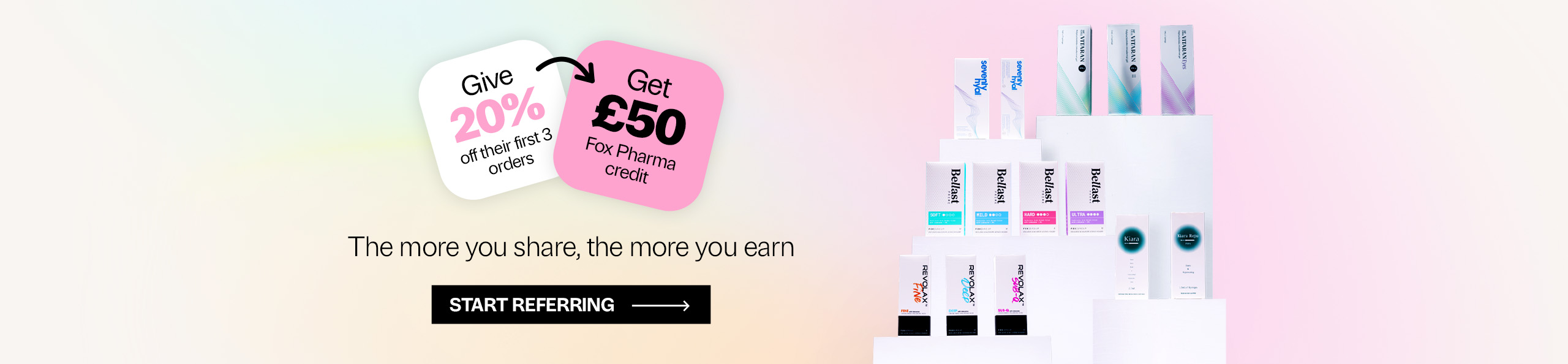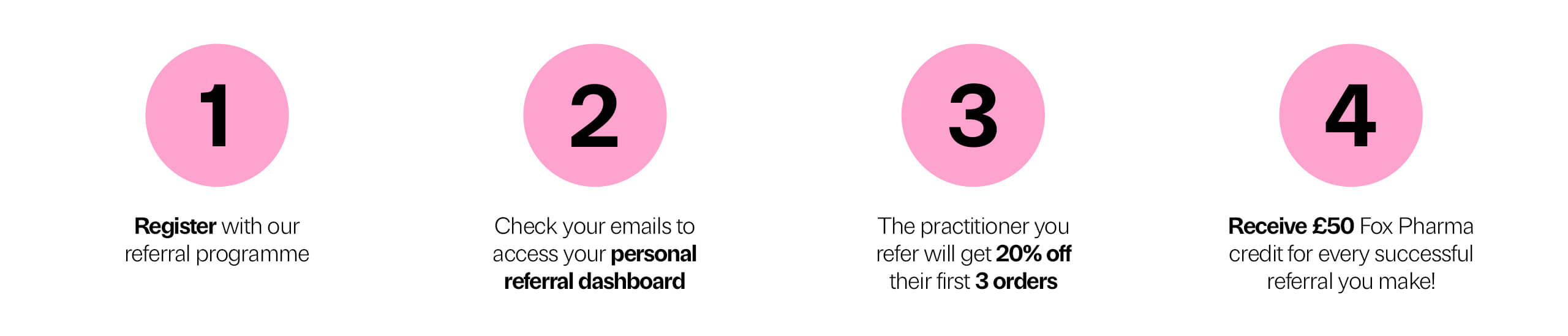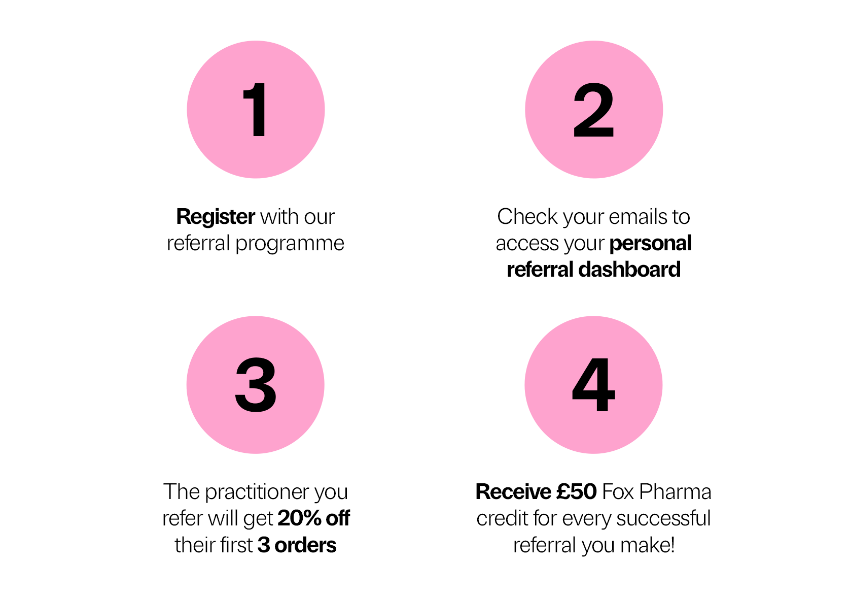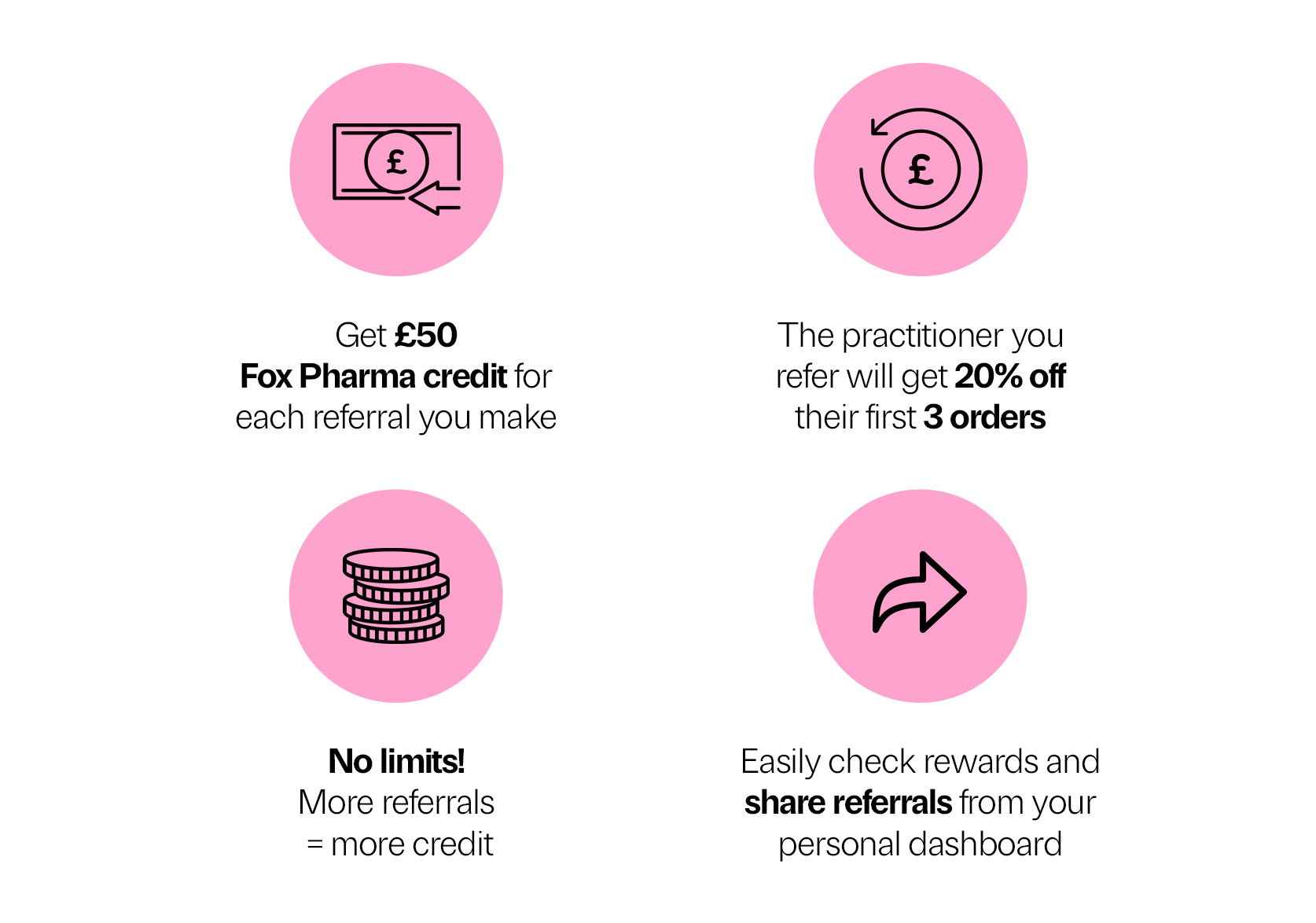 Refer a practitioner and treat them to 20% off their first 3 orders and get £50 off for yourself. Spread the word and earn rewards with Fox Pharma.