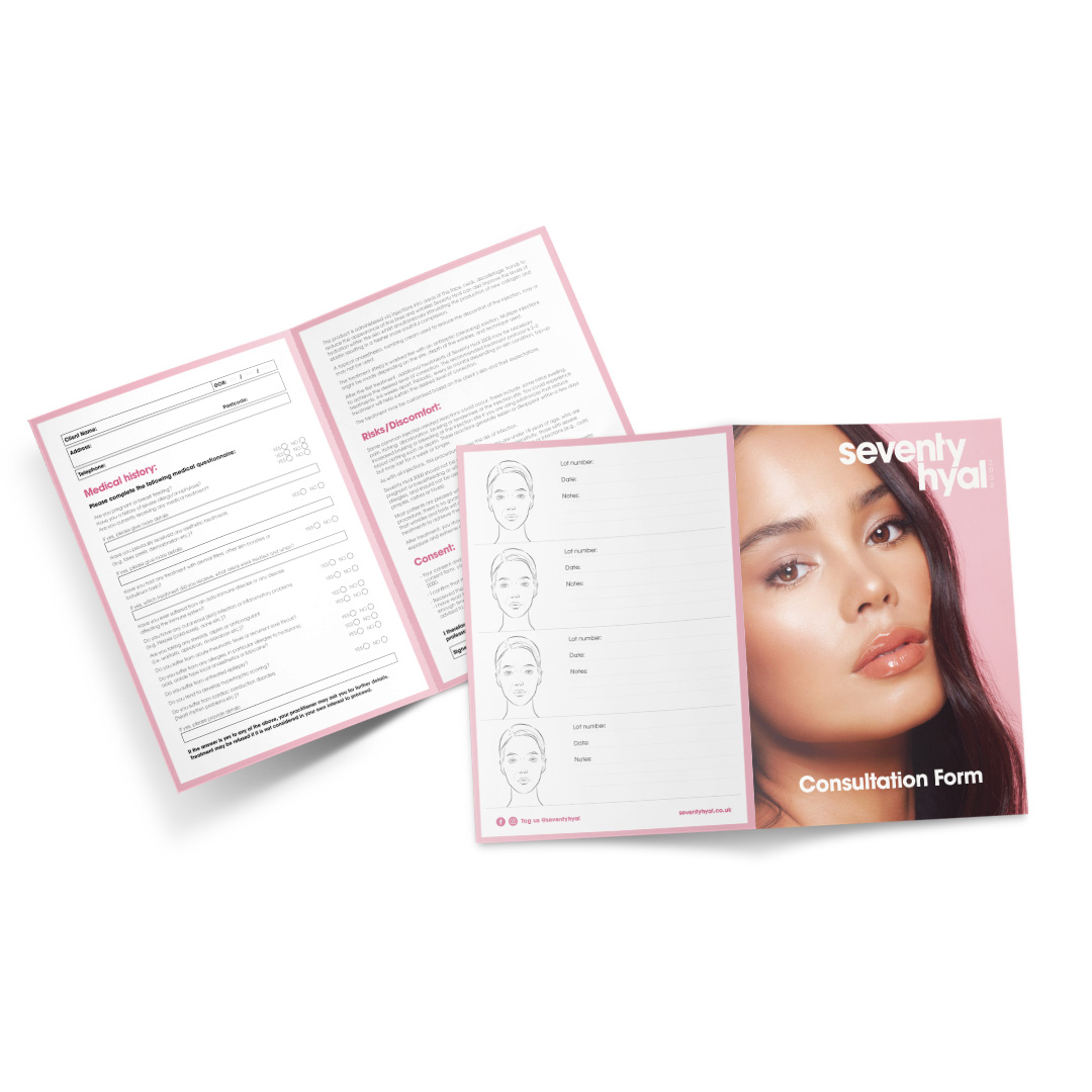 Seventy Hyal Consultation Forms include medical history, risks, discomfort and consent, to ensure all essential information is covered before treatment.