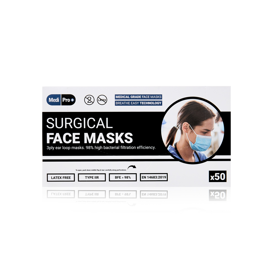 Login to purchaseThe Surgical Face Masks are latex free and fluid-resistant (Type IIR) containing an integrated nose clip and multiple layers of materials and thickness to ensure fluid resistance, protecting both the practitioner and patient. This product is CE-certificated, ensuring it meets the essential health, safety and environmental requirements.Â